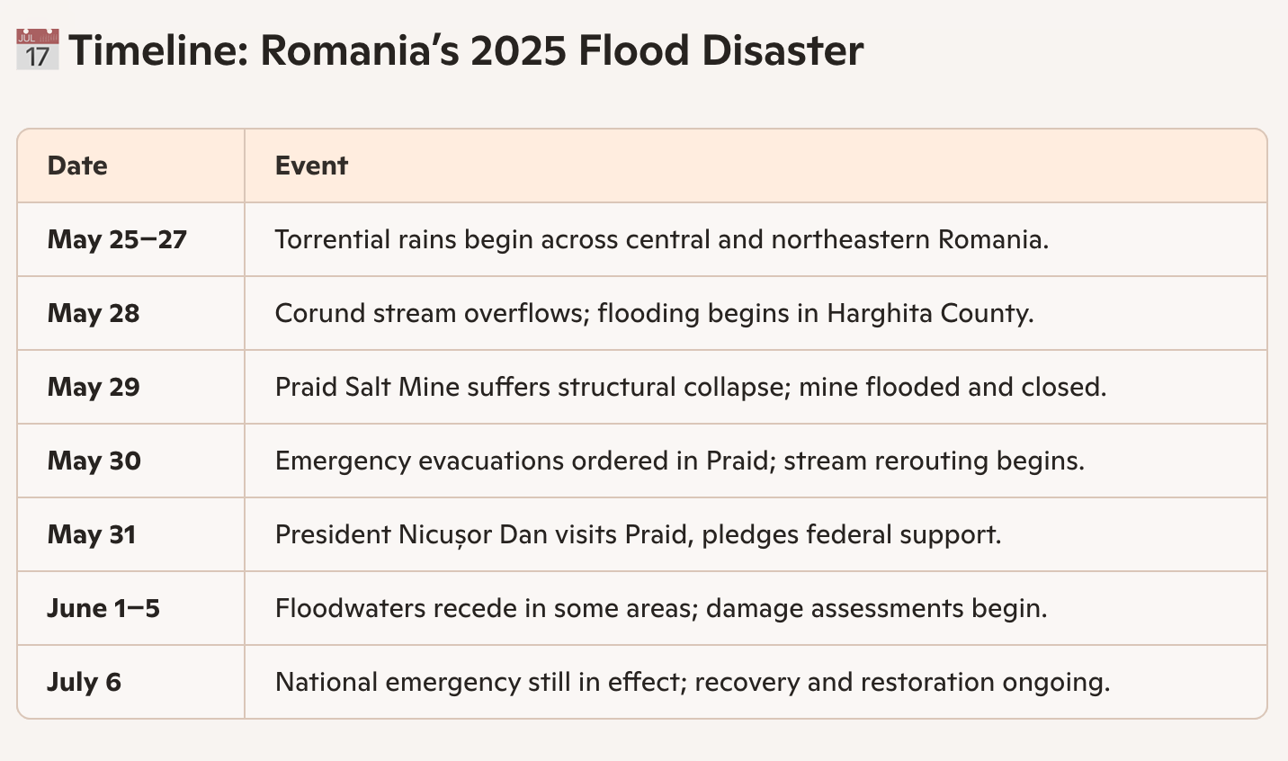 As Romania braces for more rain in the coming days, the government has declared a state of emergency in several counties and pledged financial aid for affected communities. The Ministry of Economy is also assessing whether the deeper, active mining sections of the Praid Salt Mine can be salvaged.